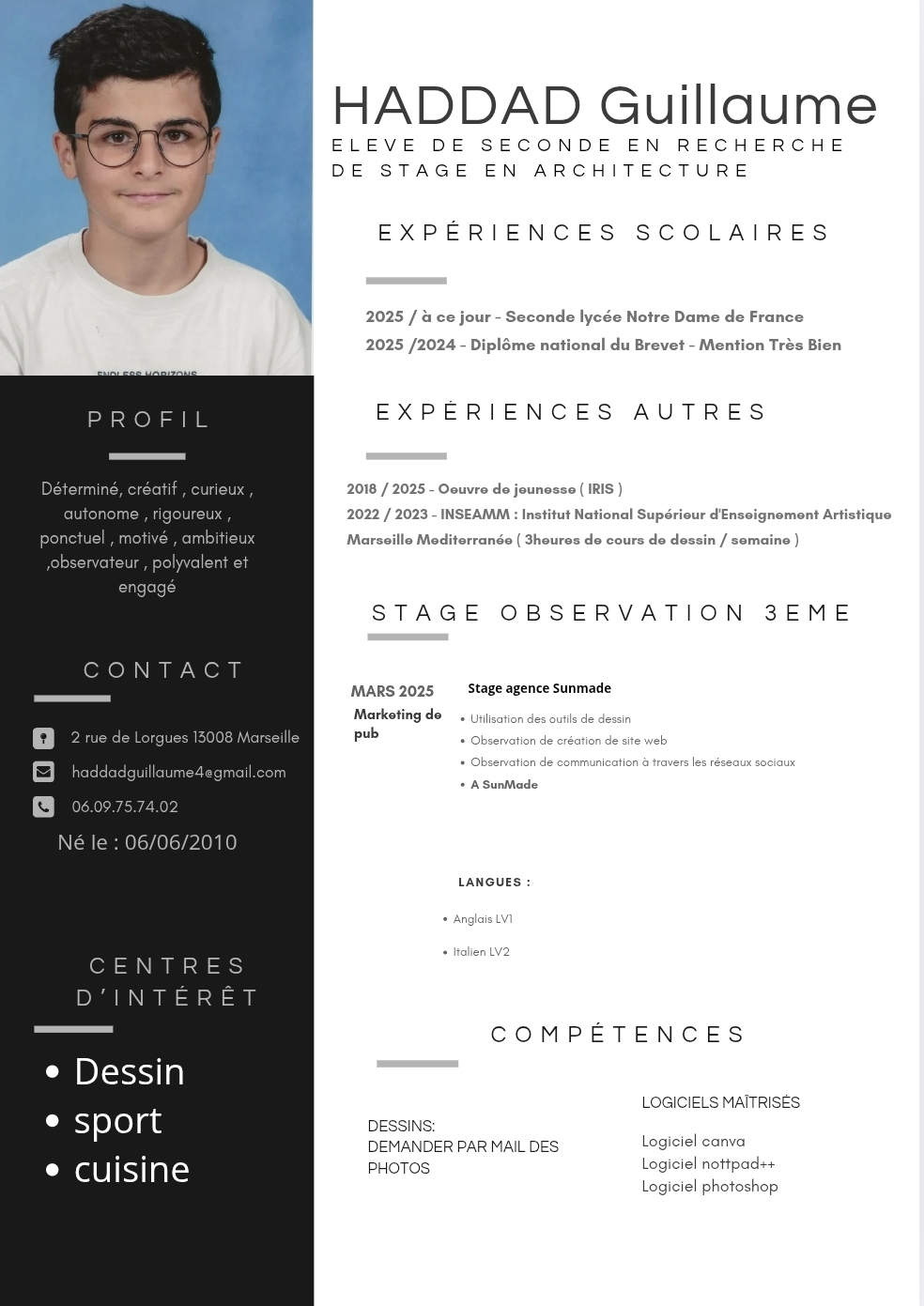 Guillaume HADDAD, élève de 2d au Lycée Notre Dame de France à Marseille, recherche un stage d’observation du 15 au 26 juin 2026 dans une agence d’architecture.